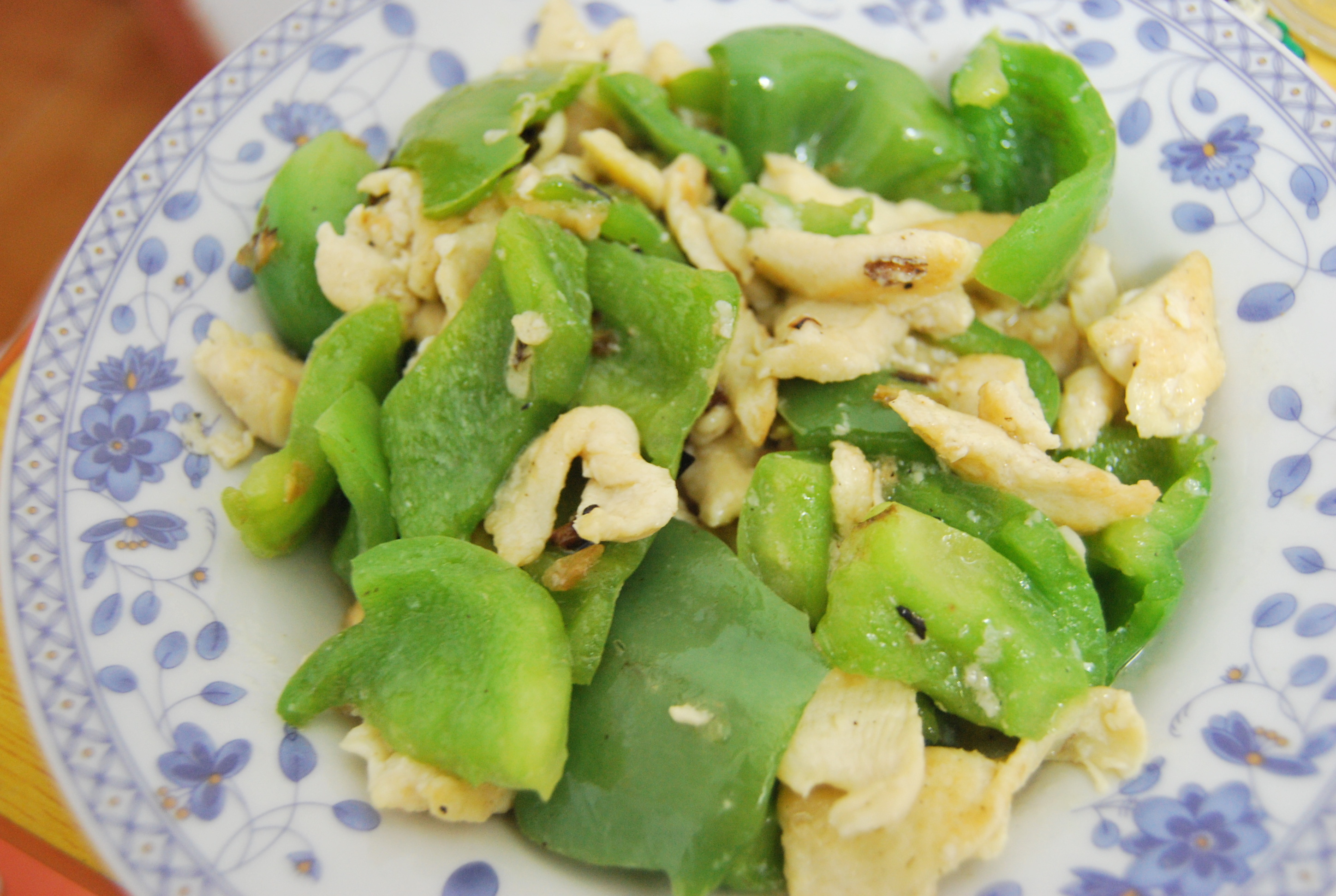 - 青椒撕碎下锅,不时加水,炒到上一步油烟被吸得差不多为止;